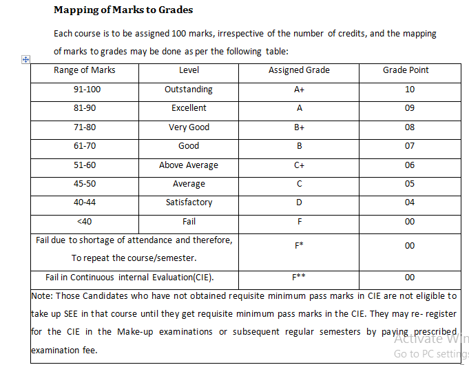 End Exam (SEE) is conducted for 100 marks (3 Hours duration). 2. In Practical course, the weightage of Continuous Internal Evaluation (CIE) is 60% and for Semester End Exam (SEE) is 40%. The student has to obtain minimum of 40% marks individually both in CIE and SEE to pass. However Semester End Exam (SEE) is conducted for 100 marks (3 Hrs duration). Grading will be awarded based on both CIE and SEE assessments. 3. The Continuous Internal Evaluation (CIE) is based on the student’s performance in Internal Assessment tests, Skill tests, Multiple choice questions, Open book tests, Student activity, Mini project, Quizzes, Assignments, Seminars, Viva-voce in practical, lab record etc as specified in respective course curriculum. 4. For Internship / Projects / Seminar etc. Evaluation is based on work done, quality of report, performance in viva-voce, presentation etc |
